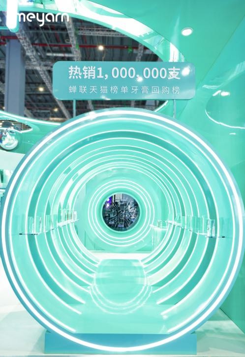 此次,meyarn以品牌色薄荷绿以及柔和的光影为效果,延续了专业、年轻、美学的品牌印象,打造出独具年轻感和专业感的展会空间,传达“让正畸护理变得简单有趣”的品牌理念。观众与嘉宾穿过光影层叠的薄荷绿净愈隧道,打卡活力满满的艺术深渊镜,感受现场100+产品带来的高品质护理体验。其中,连续霸榜天猫回购榜TOP1的防龋牙膏,在2020年上市时是国内首款做到1450ppm高氟防蛀的专业线牙膏(标准规定成人牙膏的含氟范围是500-1500ppm),可以在临界上限起到预防蛀牙、脱矿的作用。核心产品PV型正畸专用牙刷,持有PV专利刷型(专利号:ZL 2020 2 2363353.1),配合特制3色刷丝,专攻牙套口腔死角。琳琅满目的产品,吸睛有趣的互动,meyarn米妍展位人潮涌动,引发热议。