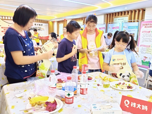 互动小游戏结束后,志愿者讲师以课堂授课的形式为现场的小朋友和家长们讲解如何判断食材的新鲜程度,科普餐桌营养搭配的小技巧,并通过“小围裙‘鲜’体验水果DIY自制”小游戏,让小朋友们体验亲自动手烹饪的乐趣。