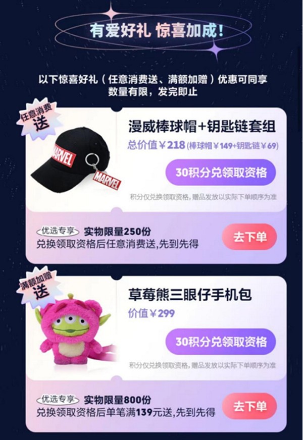 除此之外,本期优选日还新增“任意消费送”“满额加赠”玩法。总价值218元的漫威棒球帽+钥匙链套组,VIP会员可用30积分兑换领取资格,在迪士尼商城完成任意消费后获赠,实物限量250份。迪士尼《玩具总动员》中的草莓熊角色,凭借憨厚的外形和有冲击力的粉红色深受年轻人喜爱,和搞怪的三眼仔创意组合的草莓熊三眼仔手机包,VIP会员使用30积分兑换领取资格后,在迪士尼商城单笔消费满139元即可免费领取,限量800份。以上玩法均可在会员直降优惠基础上,叠加使用!9月优选日也为每位VIP会员准备了2次抽奖机会,其中包含了迪士尼限量典藏礼盒、春花烂漫系列钥匙链、草莓熊卡包和迪士尼满200减30元优惠券。