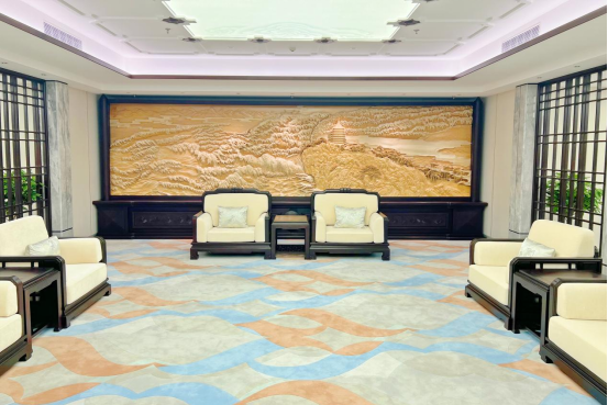 贵宾厅整体装修与所有家具秉承亚运会环保理念,并与开幕式主题《潮涌亚细亚》相契合。所有单品家具及配套软装纹样以“钱塘潮涌”为主题设计,其中凝铸亚运精神,融入杭城千年文化底蕴,以匠心木作彰显中国传统美学的无限魅力。
