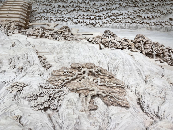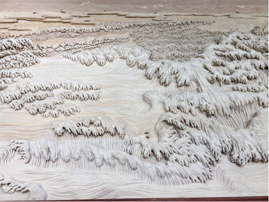 勇立潮头敢为先,乘风破浪正当时。主背景木雕《勇立潮头》采用浅浮雕、深浮雕、镂空雕、高浮雕、多层叠雕等多种东阳雕刻技艺,细腻地刻画了钱塘江及沿岸六和塔周边的景观。钱塘江浪花奔腾不息、翻涌向前,代表着乘风破浪、锲而不舍的体育精神和奋斗精神。整件作品以钱江潮涌之精神,向全亚洲传达风雨同舟、共同发展、同步向上的愿景,展现了中国的豪迈气魄。
