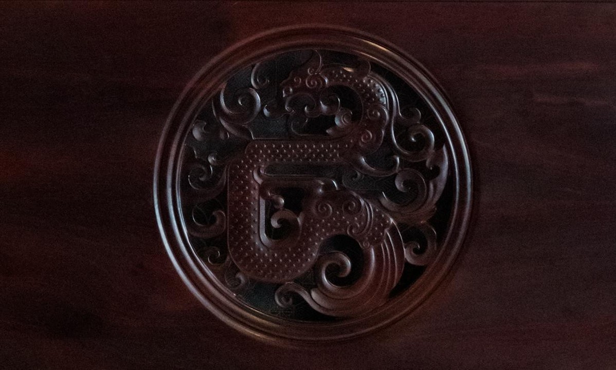 主位贵宾沙发《华夏同心》典重和雅。底作内翻马蹄足,刚劲有力;侧板透雕中国传统吉祥纹样——团龙玉璧纹,搭脑处设九块组合方块,象征着华夏文明兼容并蓄、生生不息,蕴含天、地、人和谐统一的理念,彰显民族团结合力的精神内涵。