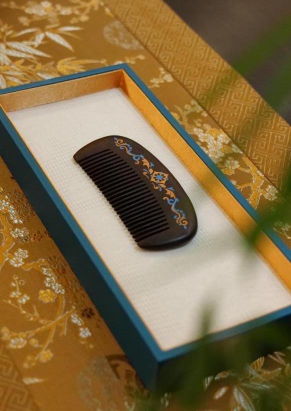 亚运宝相夫人梳,造型雍容典雅。选用珍稀小叶紫檀制,木质细腻,天然油润;正面以黄杨木、绿松石镶嵌缠枝宝相花,清新雅致;叶脉旋转翻滚,生机勃勃,富有祥云之气。