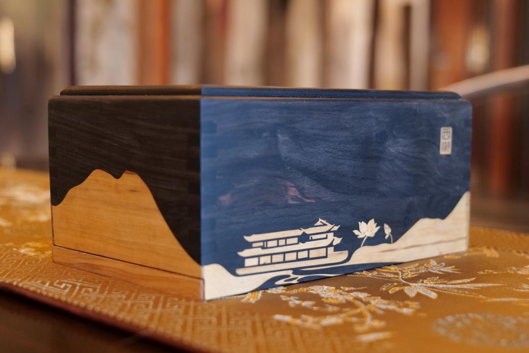 小件工艺品亦见匠心,李晓东馆长还为贵宾厅一号厅和副厅精心设计并制作了两款《杭州印象》纸巾盒。
