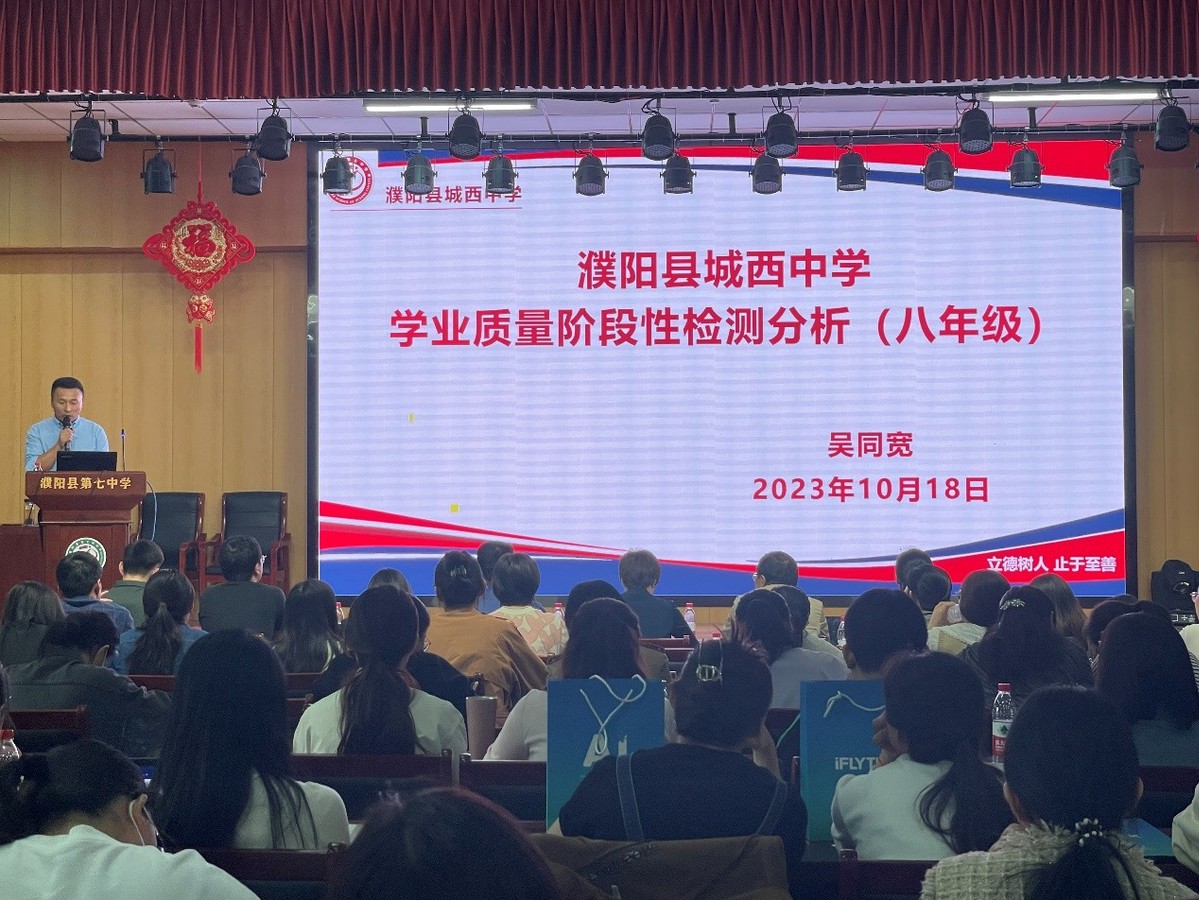 10月18日下午,由濮阳县城西中学主办、科大讯飞股份有限公司协办的濮阳县城西中学学业质量阶段性检测分析暨大数据精准教学应用研讨活动在学校多功能报告厅顺利举办。本次研讨活动旨在帮助学校更好地应用大数据精准教学系统进行学业分析,通过与智慧课堂系统有机结合实现数据驱动精准教学,助力学校因材施教,推进濮阳县城西中学教育教学质量进一步提升。本次活动由学校八年级主任张艳平主持,校长田志邦、教学副校长吴同宽、县教研室专职教研员李怀彪、英语教研员李劲松、郑州群英中学数学学科组长杨丹、科大讯飞教研员武向乐、董晓兵等人出席活动,学校七、八、九年级主任、所有学科备课组长、八年级全体教师及七九年级部分教师等共计100余人参加研讨活动。
