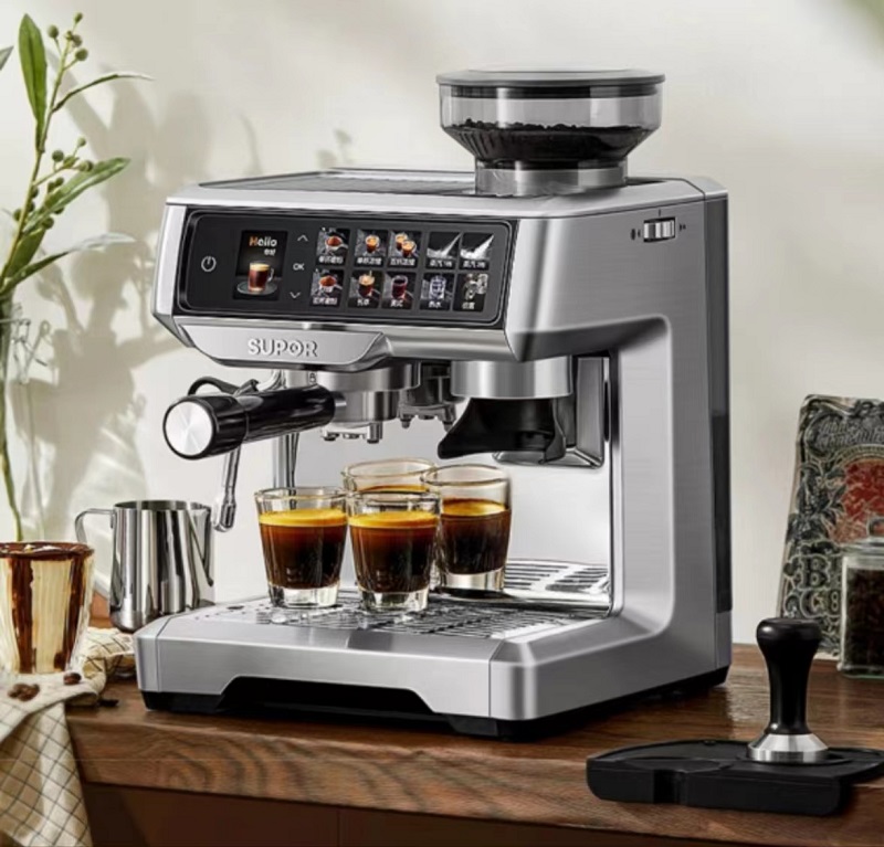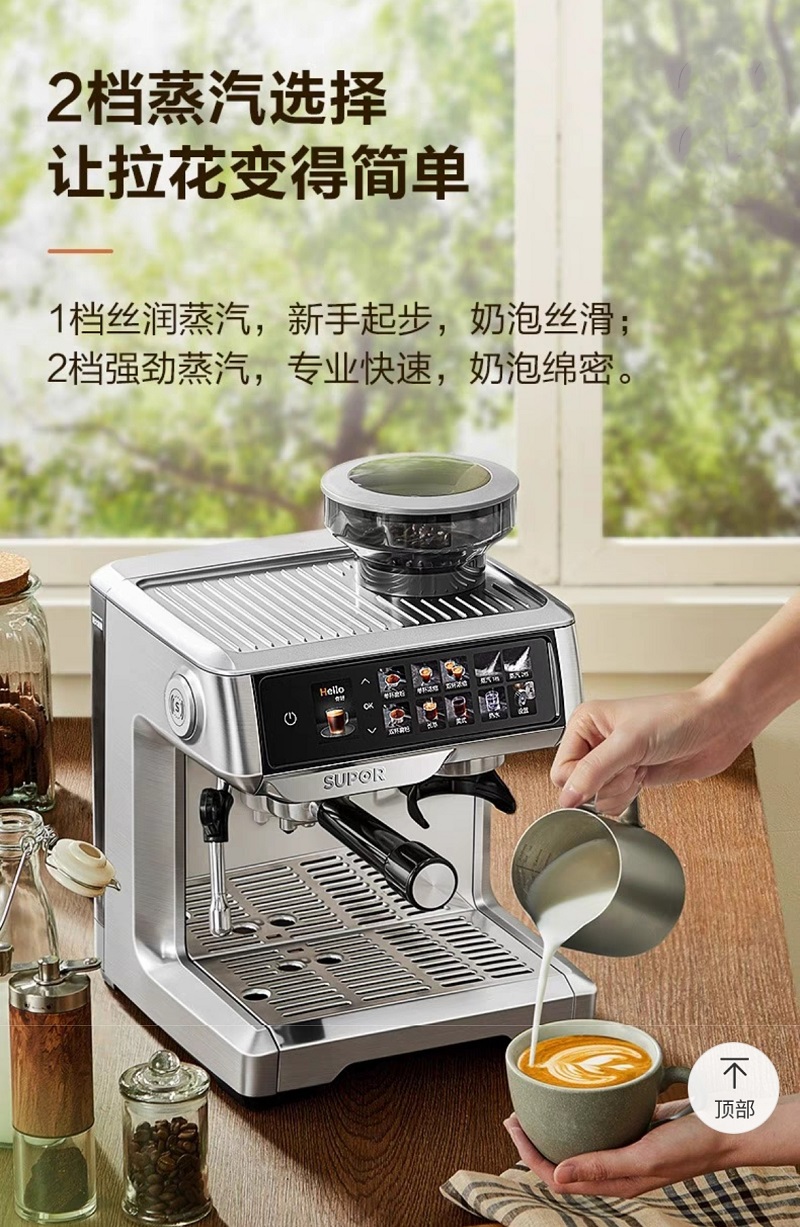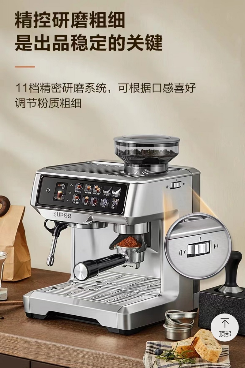 咖啡豆的颗粒大小也是影响咖啡口感的重要因素。苏泊尔半自动咖啡机配备了11档精密研磨系统,让每位用户都能根据个人口味偏好调节粉末粗细,更好地呈现出咖啡的丰富口感。例如,如果你更喜欢浓郁的咖啡,可以选择将咖啡豆研磨得较细;如果你更偏爱清淡的口味,则可以选择较粗的咖啡粉末。这一设计无疑为使用者提供了更大的灵活性和选择空间。