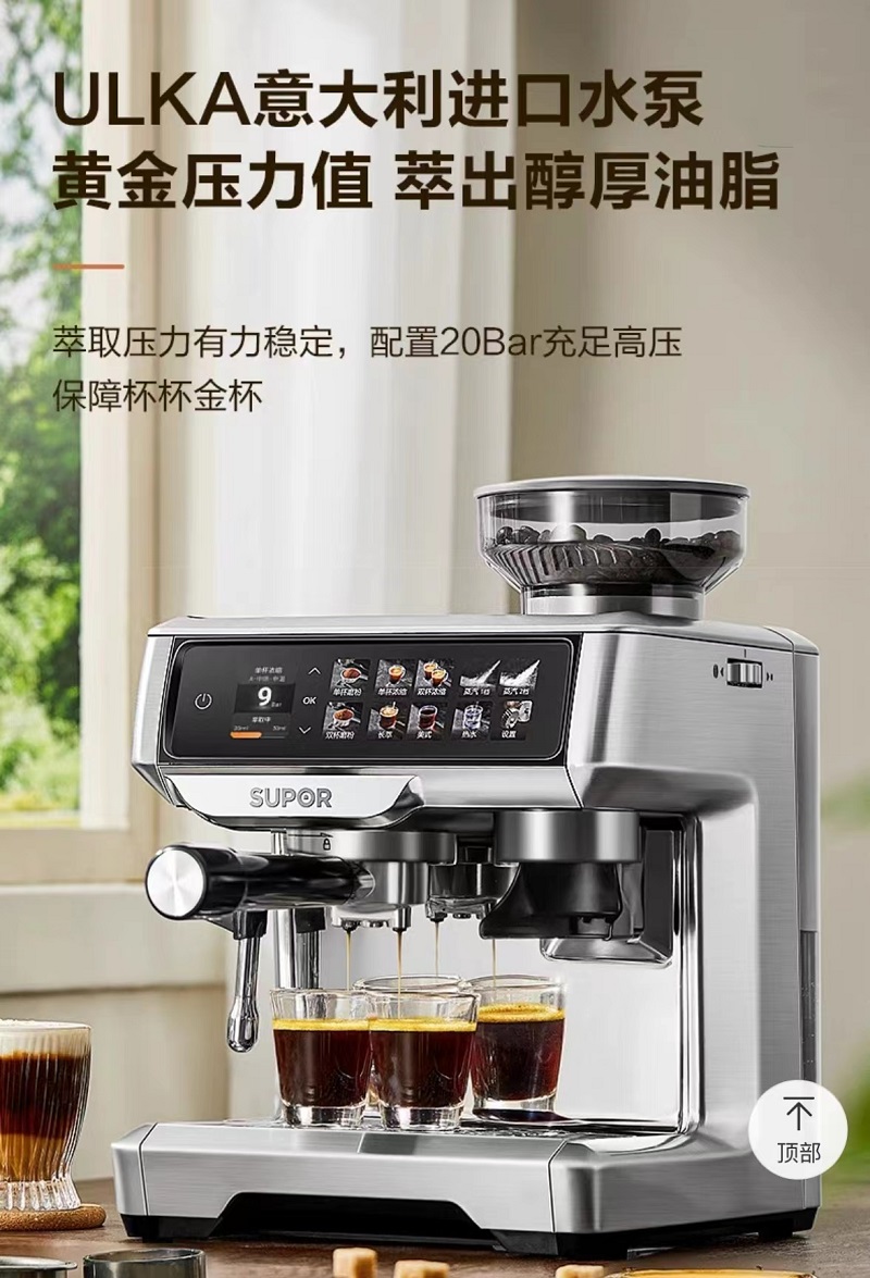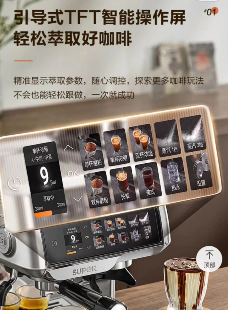 大家在考量一款咖啡机的性能时,除了外观设计,更重要的是看其内在的实力,即强大的“心脏”。苏泊尔半自动咖啡机核心动力可达到20bar的强压,这能使其有效地萃取出咖啡豆中的不同风味。无论是7bar的果酸、9-12bar的焦糖香,还是15-20bar的醇苦回甘,这款咖啡机都能满足大家在味觉上对咖啡的独特追求。