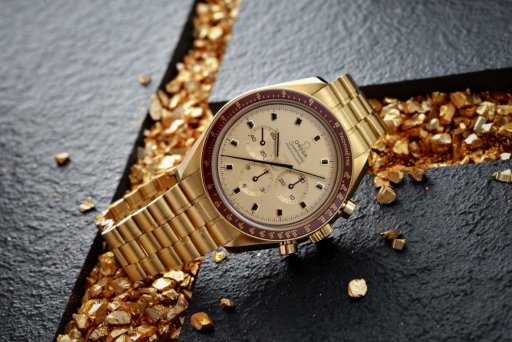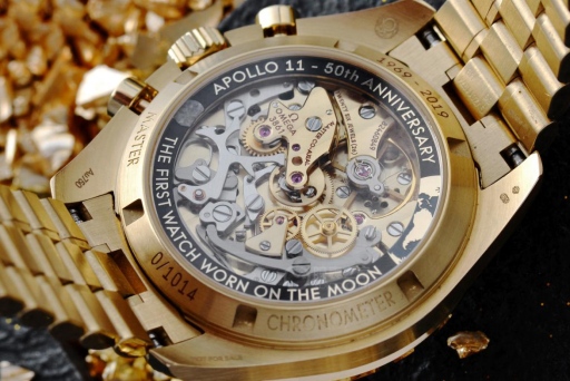 在2019年,欧米茄为纪念人类首次登月50周年,隆重推出了超霸系列“阿波罗11号”50周年纪念限量版腕表Moonshine 18K金款,限量发行1,014枚。 手表的表壳、表链、表盘及时针分针均采用Moonshine 18K金打造。