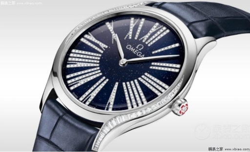 欧米茄采用Canopus 18K金打造了这枚碟飞系列名典女士手表,表壳直径36毫米,表壳两侧镶嵌有38颗长阶梯形切割钻石,迷人曲线,尽显优雅。这款手表搭配深蓝色砂金石表盘,采用“大明火”珐琅工艺制成,并饰以经钻石抛光的白色18K金指针。白色18K金罗马小时刻度表面共铺镶262颗钻石。一款精美时计,经过材质和设计的加持,成为永恒。