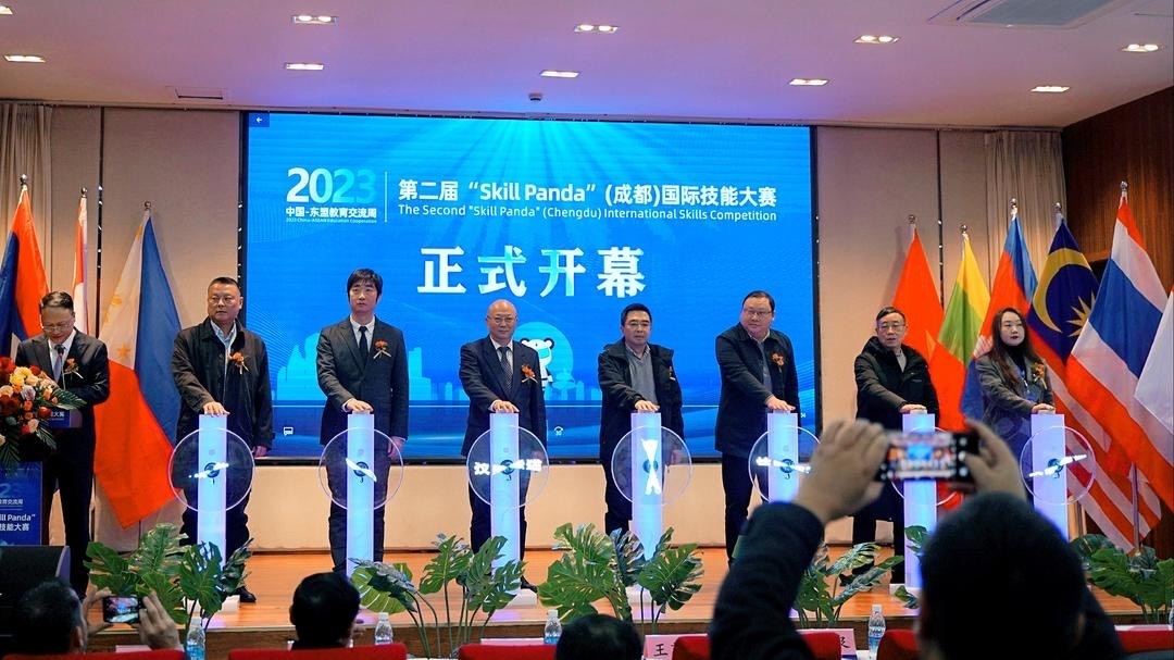 11月22日上午,“2023中国-东盟教育交流周”第二届“Skill Panda”(成都)国际技能大赛在成都工贸职业技术学院隆重开幕。四川省人力资源和社会保障厅二级巡视员、四川省职业能力建设协会会长陈泉,四川省教育对外交流中心办公室主任李乔,学校党委副书记李王英,党委委员、副校长王艺俪等相关单位领导出席了大赛开幕式,大赛裁判员代表、参赛选手代表、学生、志愿者及新闻媒体近300人参加了开幕式。