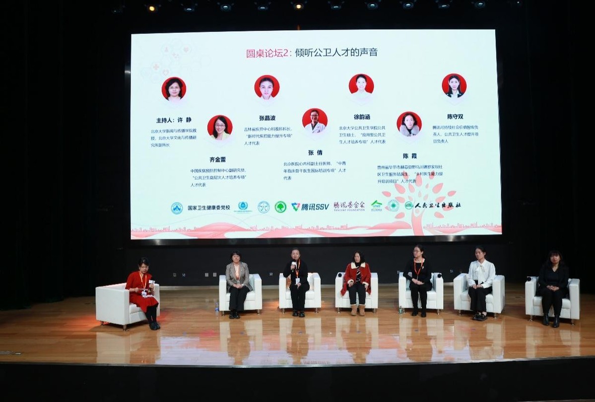 “倾听公卫人才心声共话未来”圆桌对话环节由北京大学新闻与传播学院教授、北京大学文化与传播研究所副所长许静主持,中国疾病预防控制中心副研究员、“公共卫生高层次人才培养专项”人才代表齐金蕾, 吉林省疾控中心科教科科长、“新时代疾控能力提升专项”人才代表张晶波, 北京医院心内科副主任医师、“中青年临床骨千医生国际培训专项”人才代表张倩, 北京大学公共卫生学院公共卫生硕士、“应用型公共卫生人才培养专项”人才代表徐韵涵, 贵州省毕节市赫章县野马川镇罗家坝社区卫牛服务站医生、“乡村医生能力提升培训项目”人才代表陈霞,腾讯可持续社会价值智库负责人、公共卫生人才提升项目负责人陈守双等分别围绕公共卫生人才发展和下一步设想进行分享。