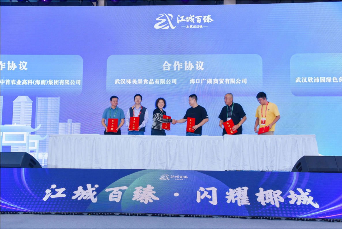 签约环节,武汉市黄陂三鲜食品加工有限公司与三亚田独顺益配送商行、武汉紫菘洪山菜苔农业科技有限公司与乡里人家、武汉味美呆食品有限公司与海口广湖商贸有限公司、武汉汪集汤业食品有限公司与海南肥猫物流信息技术有限公司、武汉绿乐农业科技有限公司与中首农业高科 (海南)集团有限公司、武汉欣沛园绿色食品有限公司与海南燕御颜值贸易有限公司上台签订战略合作协议,开启武汉与海南两地携手合作、共赢发展的崭新篇章。