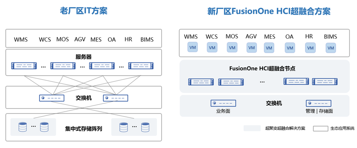 在传统服务器部署模式下,MES、WMS等10余个应用一机一应用,且额外部署专有SAN存储设备,资源利用率差,厂区机房空间浪费。