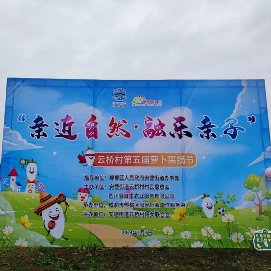 实施乡村振兴战略,是党的十九大作出的重大决策部署,是决胜全面建成小康社会、全面建设社会主义现代化国家的重大历史任务。成都市郫都区安德街道云桥村为深入实施、全面推进乡村振兴战略,以云桥村“水缘云桥”自然文化品牌传播为途径,发挥“圆根萝卜”产业文化优势,持续开展萝卜采摘节,促进农业产业品牌宣传传播,以此助力区域农业产业发展。2024年1月7日,在安德街道办事处的指导下,由安德街道云桥村村民委员会、四川谷自生农业科技有限公司主办,成都市郫都区阳光社会工作服务中心承办的“亲近自然·融乐亲子”云桥村第五届萝卜采摘节在云桥村亲耕农场顺利举行。