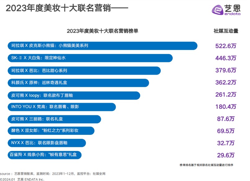 一月初,艺恩营销智库发布了《2023年度美妆十大联名营销榜单》,位居榜首的是国潮彩妆先锋品牌COLORKEY珂拉琪。除了与皮克斯联名打造的“小熊猫美美系列”在社媒全网创下了522.6万的社媒互动量,珂拉琪与芭比联名打造的“芭比甜心系列”也获得了379.6万的社媒互动量。