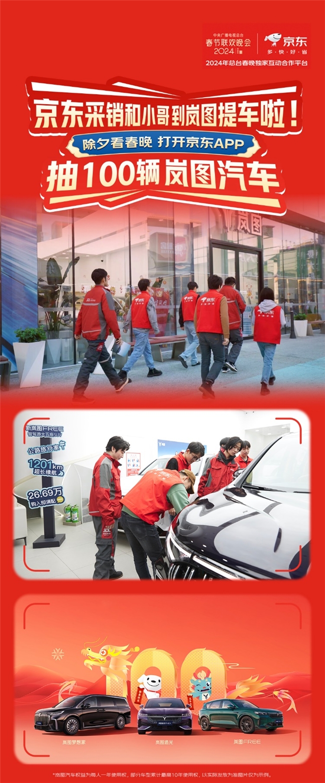 2月1日,京东揭晓央视龙年春晚最大礼:100辆岚图汽车!2月9日除夕夜,中央广播电视总台《2024年春节联欢晚会》将正式与观众见面,京东作为总台春晚互动合作平台,也将为全球华人送上1亿份实物好礼。其中,京东汽车与战略合作品牌岚图汽车携手带来了今年央视春晚的超级大奖——100辆岚图汽车使用权!大家可以在除夕看春晚过程中,打开京东APP参与互动活动,即有机会抽取岚图汽车。
