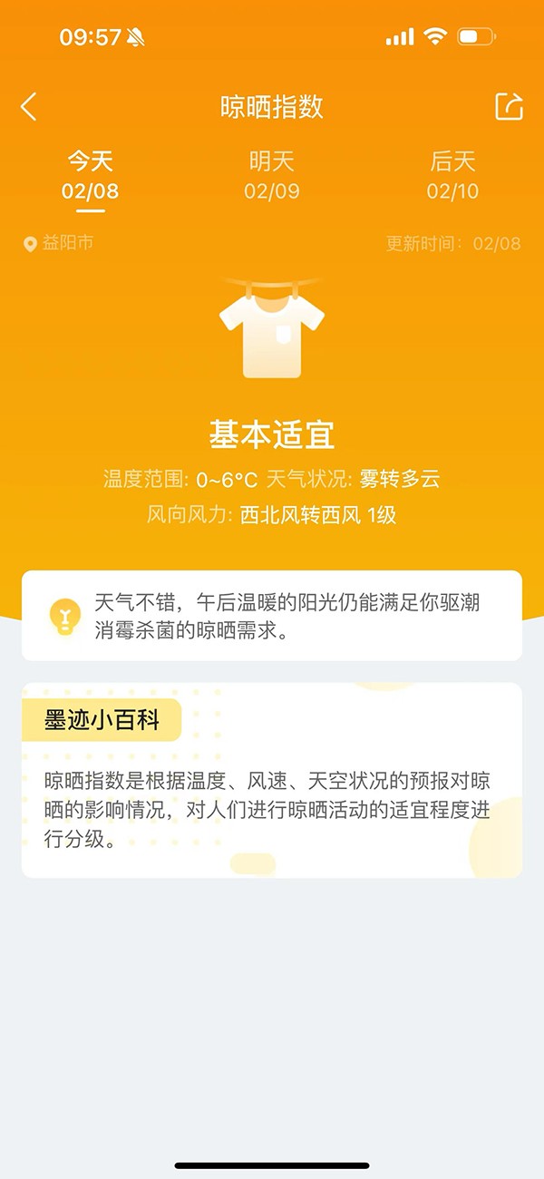 扫尘不仅是力气活,同时也要注意天气情况。为了让扫尘更加顺利,墨迹天气提供了晾晒指数功能,让用户的清洗工作更加科学、合理。我们可以根据晾晒指数的提示,安排合理时间清洗家里的窗帘、床单等物品,确保它们能够顺利晾干,以一番新气象辞旧迎新。