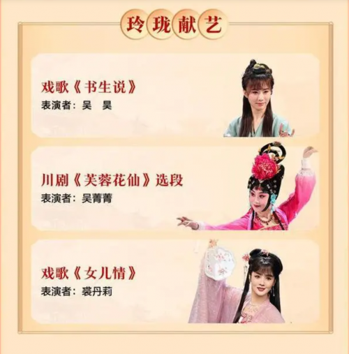 这场晚会,有20余位戏剧梅花奖、白玉兰奖及曲艺牡丹奖得主加持。京剧名家王珮瑜、李军、奚中路及豫剧名家小香玉分别领衔“惊鸿”“风雅”“龙虎”“江湖”四大戏社,在相声演员、“出题官”高晓攀的牵引下,经历“理、智、绝、情、无题”五轮考题,完成这场“梨园秘宝”之争。京剧名家张馨月、评剧名家孙路阳,戏曲评论家崔伟、央视主持人海阳化身“抖机灵官”这一角色,以多维度视角评论和解读每轮较艺,趣聊台上台下、畅谈戏里戏外。另有京剧名家孟广禄、川剧名家吴菁菁,豫剧名家李树建、粤剧名家曾小敏、评剧名家曾昭娟、昆曲名家张军等带来精彩表演。