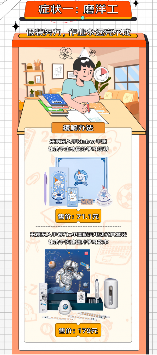 “磨洋工”是许多孩子开学之后的一大“症状”,虽然表面上看起来非常努力,且按时学习做作业,但无论熬夜到多晚都无法完成作业,学习成绩也无法提升。想要帮助孩子规避这种问题,其实做好规划提升效率非常重要。可在京东花费71.1元入手kinbor手账,内容丰富的手账产品能够让孩子主动培养做规划的兴趣,从而自己做好学习规划,摆脱“磨洋工”的习惯,让每一次努力都有成效和价值。除了做好规划,学习效率也同样重要,京东价179元的得力×中国航天电动文具套装内含HB洞洞铅笔、电动橡皮擦、全自动削笔机、桌面清洁器、橡皮擦替芯等多件产品,让孩子能够节省更多时间投入到学习中,在新的一年快速进步。