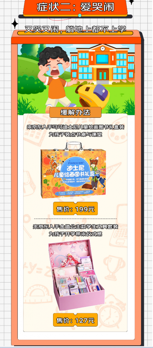 “磨洋工”尚可培养改正,开学后哭闹打滚死活不想去学校的孩子才让父母头疼。其实这是因为孩子对课堂和学习都没有兴趣,家长要做的是帮助孩子打造丰富多彩的学习环境,且在开学之际给足孩子仪式感。京东价199元的马克迪士尼儿童绘画图书套装有73件绘画工具和2本迪士尼涂色书,让孩子能在课余时间拥有自己的兴趣时间。京东价127元的金值公主款学生文具套装则在配色、产品、实用性等多个方面为孩子带来了开学的仪式感,能让孩子对开学和上课充满期待。