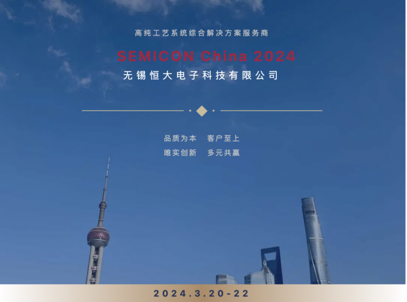 3月22日,SEMICON CHINA 2024在上海新国际博览中心落下帷幕。作为一家专精特新“小巨人” 制造型企业,无锡恒大电子科技有限公司现场展示了为半导体芯片制造、新型显示、新能源、生物制药、机械制造等行业核心工艺提供完整且先进的高纯工艺系统和洁净工艺系统的综合解决方案,吸引了众多客商驻足洽谈。