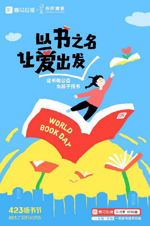 一直以来,喜马拉雅坚持“以声音行大爱”,践行企业社会责任。2023年的“423听书节”,喜马拉雅携手春晖博爱发起“把书种下,让梦发芽”公益捐书活动,在孩子们心中种下阅读的种子,而今年喜马拉雅再度携手春晖博爱,让发芽的种子茁壮成长,让孩子们通过阅读遇见更广阔的世界。上喜马拉雅App搜索“423公益”,参与捐书行动,一起用爱抵挡风雨,用书铺出一条通往远方的路。