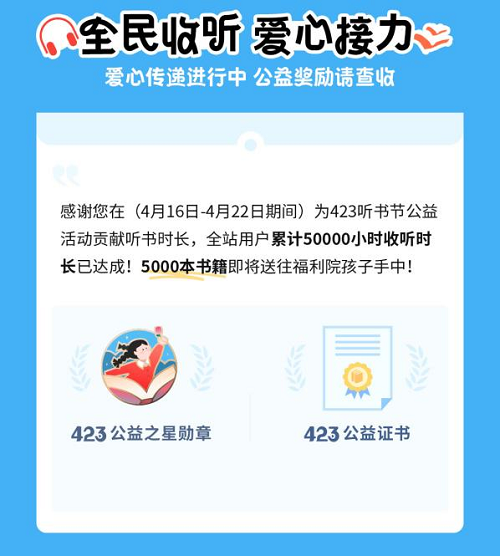 4月16日0:00:00-4月22日19:59:59期间,用户可在喜马拉雅App搜索“423公益”,进入“以书之名,让爱出发”活动页面,收听站内任意专辑,加入捐书行动。全站用户累计完成50,000小时收听时长后,喜马拉雅将向春晖妈妈项目支持的多家福利院的儿童捐赠总计5,000本实体书。而参与了活动的用户可在4月22日20点至4月29日期间,前往“423听书节”页面领取“423公益之星勋章”及“423公益证书”,留作纪念。万茜、张钧甯、papi酱、李若彤、韩栋、文咏珊作为春晖博爱爱心大使,邀请公众一起读书做公益,为春晖宝宝们捐一本书,让梦想照进现实,让孩子们的世界更加璀璨。