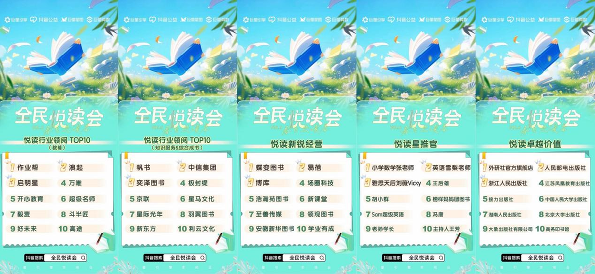 基于独特的平台能力和平台优势,巨量引擎「全民悦读会」一方面持续连接图书从业者、出版社、创作者,共同荐书、买书、读书 ,推进抖音阅读风尚;一方面不断扩展图书生态边界,丰富消费者多样化的阅读方式和购书链条,同时为出版业、商家带来更多生意经营新机会。