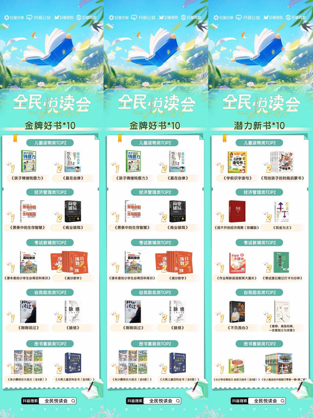 依托图书内容生态与行业号召力,「全民悦读会」围绕内容力、经营力、影响力三大模块展开。在打造内容力上,聚焦阅读文化价值,借助头部文化名家的权威背书、超百位阅读达人的优质书单分享以及权威"悦读”数据报告 ,让更多好书被看见。在经营力上,「全民悦读会」首创荣誉冲榜机制,通过节点冲榜流量扶持、星图直充优质内容加热、悦读奖杯和榜单表彰标杆等方式 ,激励商家短视频和直播推书、售书,促进节点营销提质增效。