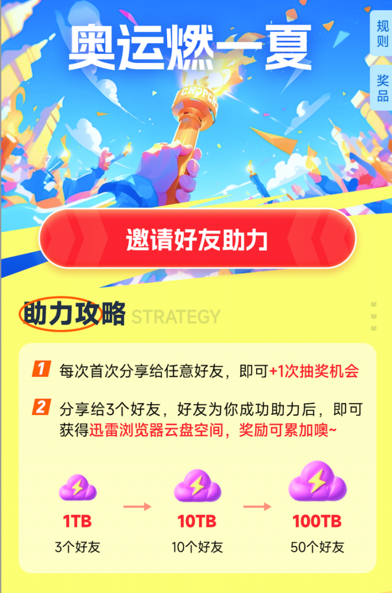 该活动于7月18日上线,让我们来一场线上火炬传递,为即将出发的中国健将们加油。将迅雷浏览器更新至最新的版本,打开APP,点击搜索框上方的“XUNLEI”或在搜索框“燃一夏”即可直达活动页面。将火炬传递,邀请好友助力,还将获得100T云盘空间。