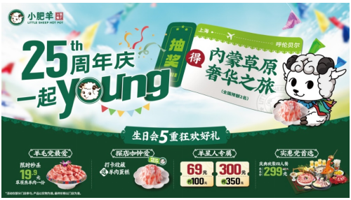 值此25周年庆之际,小肥羊也推出多重好礼,回馈广大消费者的厚爱。消费者可在大众点评、抖音平台选购限时秒杀活动优惠券、专属消费代金券,和小肥羊一起庆生一起YOUNG!