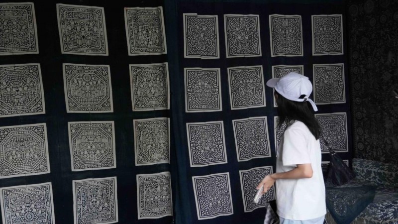 团队成员欣赏蓝印花布作品 蒋唯乐摄