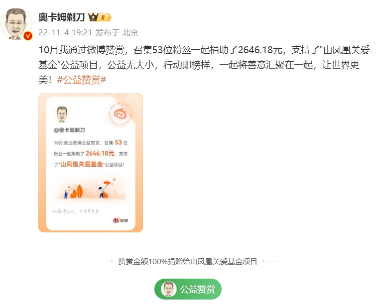 微博大V@奥卡姆剃刀 加入微博“公益同行计划”,自2022年起成为“山凤凰女生助学计划”公益赞赏达人,持续在个人微博发布与项目相关公益内容,号召微博网友共同关注项目,进行倡捐。项目组也与大V建立了深厚的关系,及时反馈项目进展、山凤凰们的感谢信等,@奥卡姆剃刀 都会在微博进行展示。2022年,@奥卡姆剃刀 收获了543次爱心网友的公益赞赏支持,入围了2022年公益赞赏年度“V赞赏力”榜单TOP20,并于“坚韧的力量·2022年度慈善盛典”获得了“年度传播之星”。
