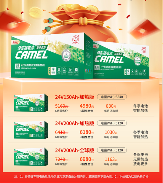 此次参加“分期购”活动的是骆驼驻车锂电池3个主要型号,适用于市场上绝大多数商用车,尤其是安装有驻车空调的重型卡车。用户通过京东白条可以分3期或6期购买,电池的价格(以旧换新后)较零售价更优惠。大额支出变小额分期,卡友们可以在不增加经济压力的情况下体验更舒心的用车生活。