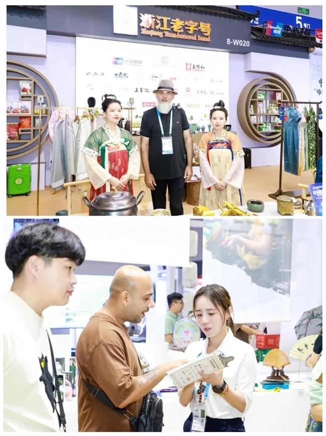 展会期间,多位外国商务官员和文化使者到访展会,与老字号企业进行互动交流,为老字号走向国际市场、开展中外文化交流搭建了桥梁。他们对中国传统文化的独特魅力表示赞叹,认为此次展会为促进中外文化交流提供了绝佳平台。特别是去年就参观过“国潮秘境”的Iqbal Khurram先生,今年再度找到“国潮秘境”展区,与老字号企业亲切互动。
