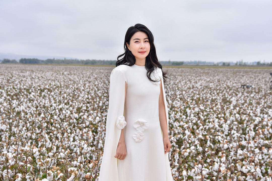 郭晶晶身着一袭由全棉时代创新面料风柔棉和褶皱纱布高级定制的白色长裙礼服亮相,以明亮谦和的自然之美融入棉田,为大秀增加一道亮丽的色彩。她表示:“来到这里,看到大片的棉花,真实地感受到了棉田让沙漠变绿洲的力量。当我亲手触摸到这些柔软的棉花,再穿上由全棉时代优中选优的好棉花做成的衣服,更是感受到安心。”