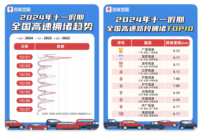 数据显示,今年十一假期期间,全国高速平均拥堵里程为1649.98公里,较2023年国庆节同期上升48.2%。全国高速拥堵峰值出现在10月1日10:30,拥堵里程为9652.3km。