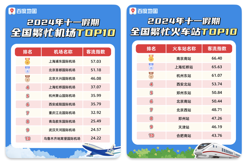 10月8日,百度地图发布《2024年十一假期出行报告》,洞察全民十一出行动向。数据显示,游乐园、博物馆成为热门游玩目的地,客流量成倍数增长;火车站等全国客运枢纽客流普遍上升;十一假期TOP10热门景区山川江湖等自然主题风景区占据7席。