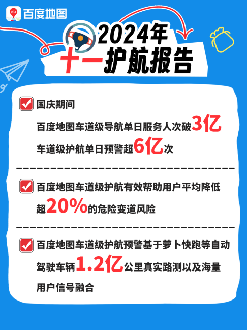 国庆期间全民出游热情高涨,在十一前夕,百度地图发布“V20国庆版”,车道级导航已实现村村通,全国超41000个城乡镇道路全覆盖。同时,行业首发“车道级护航”产品,实现异常车辆、高危路段、重大事故的超视距实时提醒,守护每一位驾驶员的安全出行。据了解,国庆期间,百度地图车道级导航单日服务人次破3亿,车道级护航单日预警超6亿次;基于萝卜快跑等自动驾驶车辆1.2亿公里真实路测以及海量用户信号融合,有效帮助用户平均降低超20%的危险变道风险。