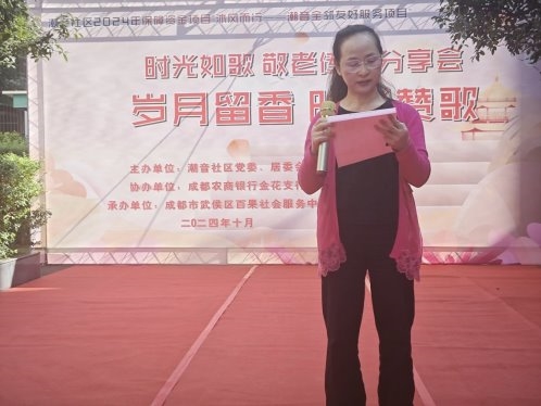 随后的故事分享时间更是触动了每一位参与者的心弦。荣获2023年度武侯区孝亲敬老模范称号的嘉宾分享了自己生活中关于照顾邻居大爷的点滴往事,深深打动着现场每一个人。此外,多位才华横溢的老年朋友们也纷纷登台表演,用实际行动证明了年龄从来不是限制追求梦想的理由。