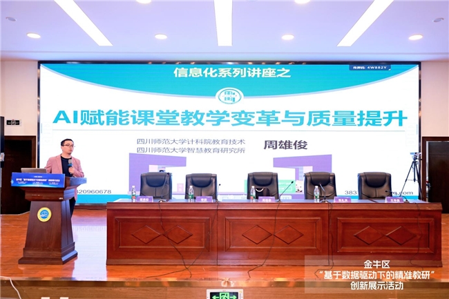四川师范大学计算机科学学院周雄俊教授,金牛区教育局科技科科长李政,金牛区教科院信息化培训部主任程弟松,金牛区高中语文教研员王美华,成都市铁路中学校校长张礼洪以及区内各学校教师代表一同出席活动,展开交流分享。