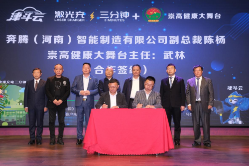 发布会上,奔腾(河南)智能制造有限公司董事长邢国恩与帕希姆数字自贸区法人代表庞玉良,进行津斗云激光充三分钟充电携手帕希姆数字自贸区为全球提供新能源数字化应用解决方案签约。