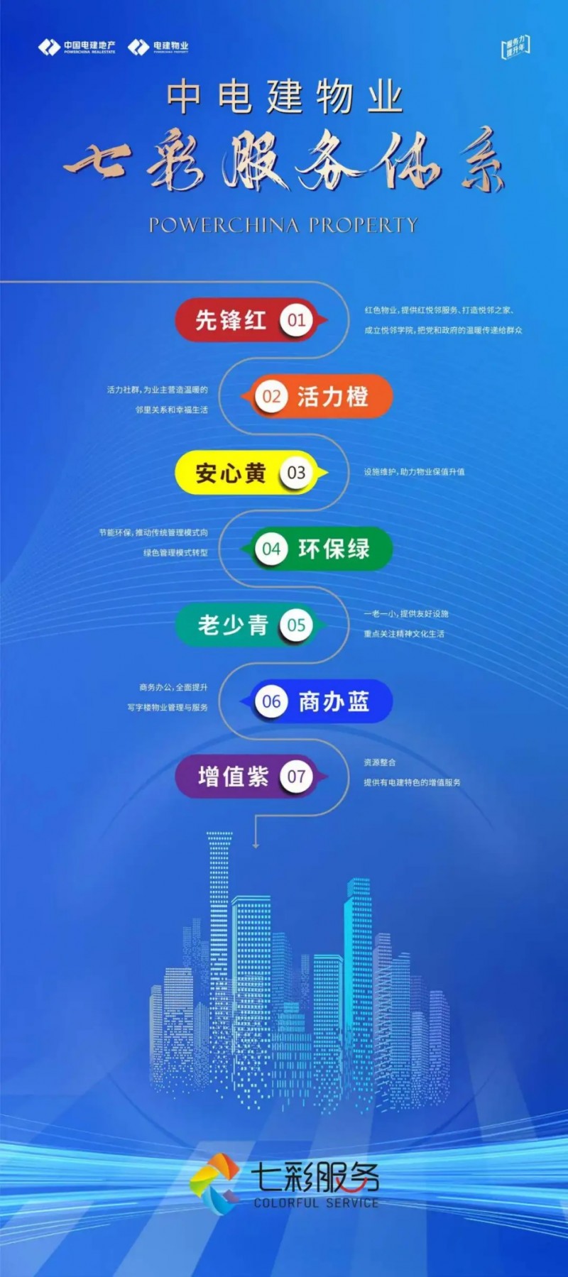 其中,先锋红 聚焦红色物业引领,通过红悦邻服务,打造悦邻之家,成立悦邻学院,把党和政府的温暖传递给业主、群众;活力橙 聚焦多彩社群活动,为业主营造温暖、有烟火气的邻里关系和幸福生活;安心黄 聚焦软、硬件设施维护,助力物业服务保值升值;环保绿 依托绿色环保理念,降低能耗,推动传统管理模式向绿色管理模式转型;老少青 关注“一老一小”需求,提供友好设施,多角度开展精神文化生活建设;商办蓝 聚焦商务办公专业服务,针对多元需求,全面提升写字楼物业管理水平;增值紫 挖掘增值服务的广度与深度,整合优质资源,提供具有电建特色的增值服务。