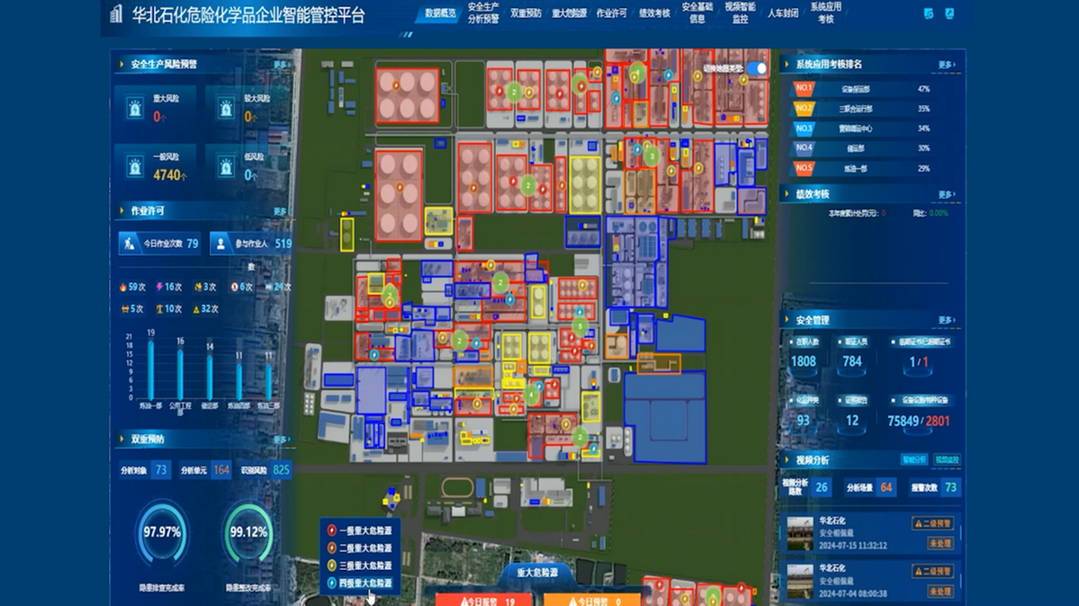 打开智能巡检系统,可以查看巡检人员的实时动态、巡检轨迹等情况;登录智能管控平台,可以实时监测危险化学品的液位、温度、压力等指标,及时评估、分析安全风险,闭环管理预警信息;通过设备管理平台,实现对设备全生命周期的管理和预测性维护,避免非计划停机停产……走进中国石油天然气股份有限公司华北石化分公司(以下简称“华北石化公司”)管控中心,可以切身感受到数字化、智慧化手段与生产、管理各环节的深度融合。