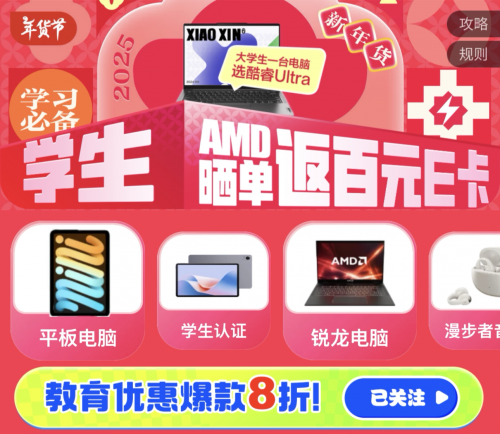 为满足大学生群体对物美价廉3C数码产品的需求,京东精心打造了“2025教育优惠新年货”主题会场,甄选了众多爆款手机、平板、笔记本电脑、耳机等产品,学生群体更可享教育优惠爆款8折福利。大学生只需打开京东APP,搜索“教育优惠”即可进入活动页面,以超低的价格入手心仪的好物。