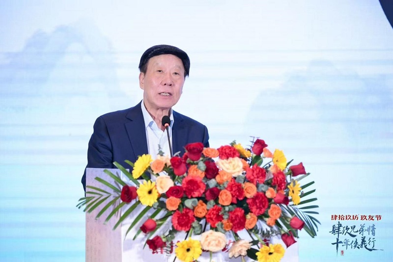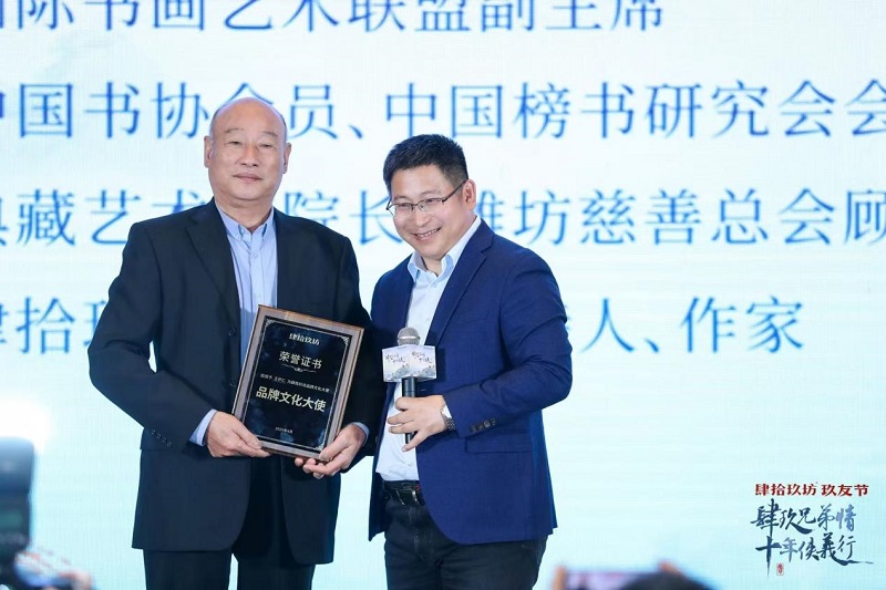 国际书画艺术联盟副主席、中国书协会员、中国榜书研究会会员、典藏艺术院院长、潍坊慈善总会顾问、诗人、作家王怀仁,也出席了肆拾玖坊玖友节现场,肆拾玖坊创始人张传宗为其授予了“品牌文化大使”证书,以进一步推动中国传统文化与酱酒文化的融合创新发展。