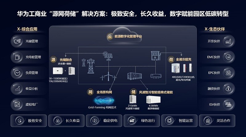 在展台上,华为推出工商业源网荷储一体化解决方案,吸引众多专业观众驻足交流。源侧从纯光转向光储融合,提升绿电消纳比例,工商业光储全周期收益最优;网侧更优电能质量、更高可靠供电、更强带载能力,全场景构网支撑企业高质量用电;荷侧“光储充+构网技术” ,减小兆瓦超充对电网冲击,提高整体收益;储能,首款风液智冷储能柜,更高效率,长久可靠,生命周期收益增加10%+;系统级主动安全解决方案,保障园区用能长期可持续发展;同时,华为携手伙伴提供园区“综合能源/虚拟电厂” 管理系统。工商业源网荷储一体化解决方案,可实现极致安全、长久收益,数字赋能园区低碳转型。