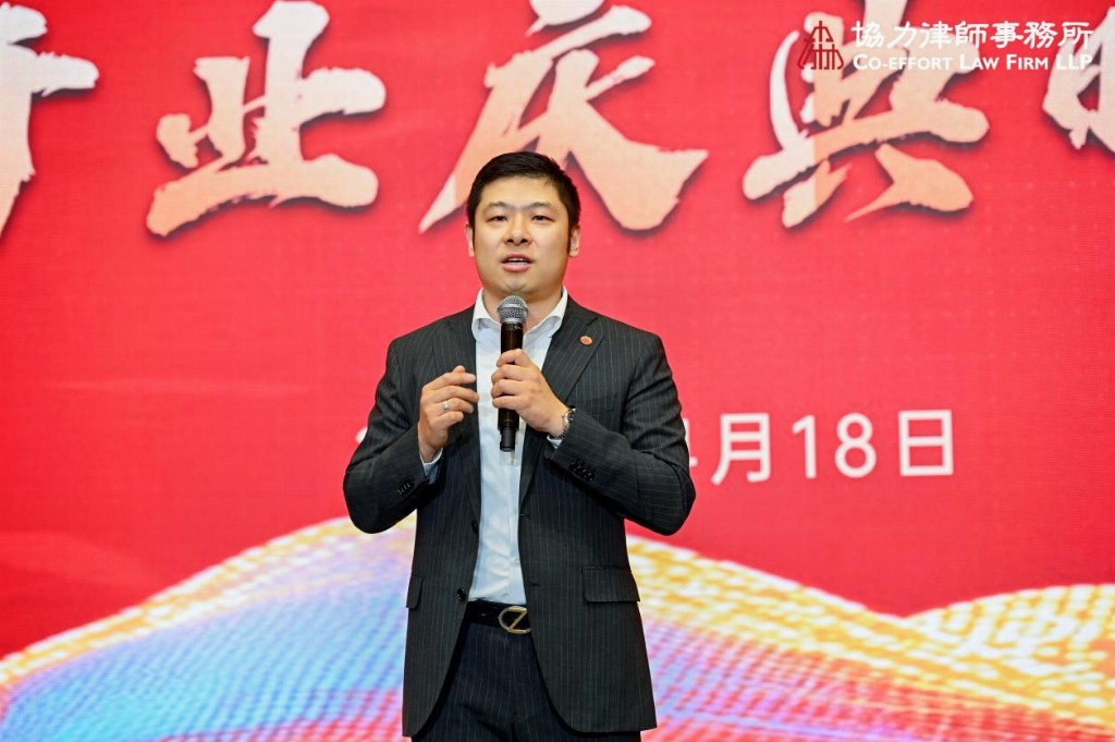 上海市协力律师事务所主任祝筱青致辞。他表示,今日不仅仅是祝贺协力泰州的开业,更是见证协力在长三角法治版图上落下关键一子。最后他借凤凰城千年祥瑞,祝愿沪泰法治协作如三水长流。