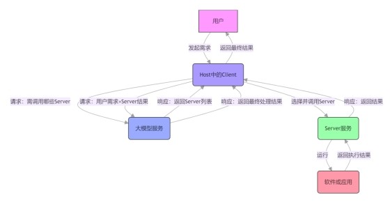 SunwayLink平台中的MCP核心组件包含Host、Client、Server,Host内置了 Client的应用程序,可以是APP、Agent、Web应用、桌面应用等形态,Client是大模型与Server之间的桥梁,Server负责处理来自Client的请求、调用各种资源、返回相应的结果或数据,MCP工作流程如下: