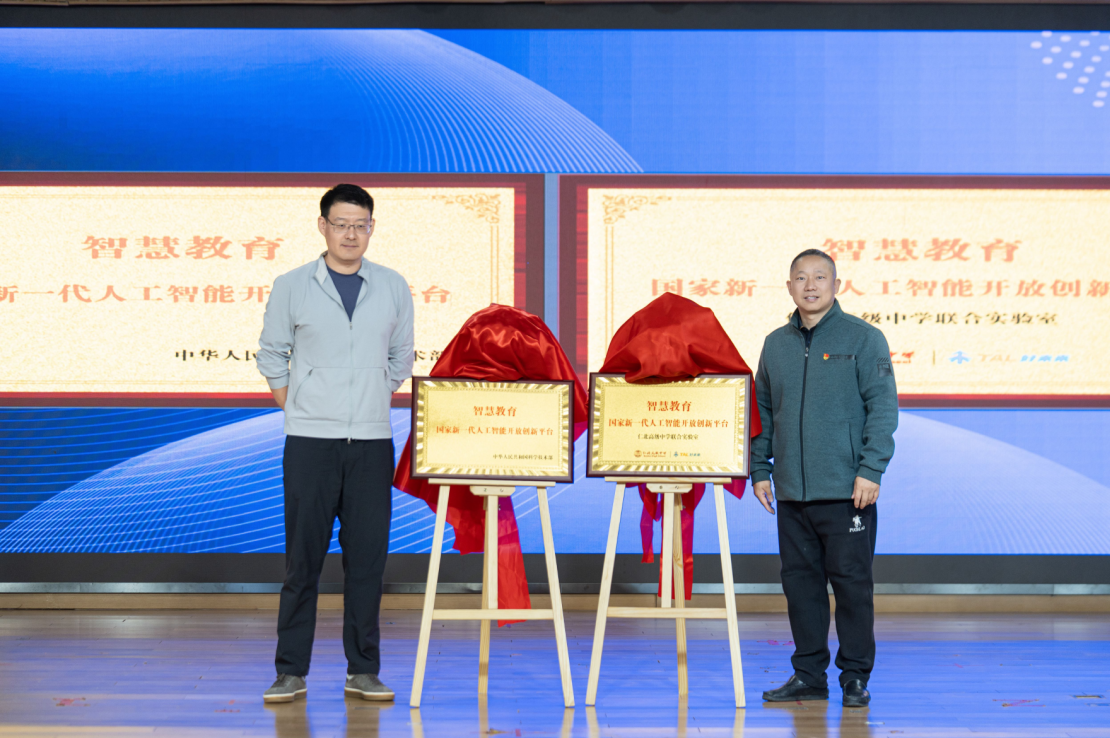 九章爱学运销负责人张宇鹏与仁北高级中学校长张超月共同为“智慧教育国家新一代人工智能开放创新平台仁北高级中学联合实验室”揭牌